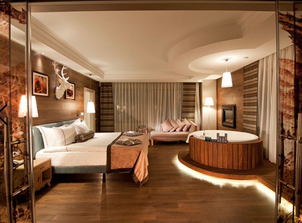 ROOM FEATURES: Jacuzzi in front of the window (Jacuzzi can be square or round), 2 Bedrooms + 1 Living Room, 2 Electric Fireplaces, Modern Mountain Concept Decoration, Sofa,